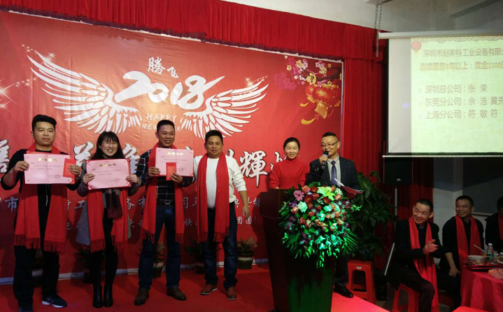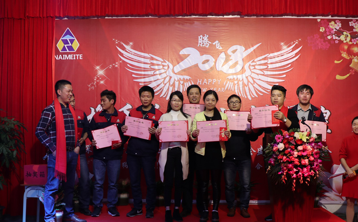 席間耐美特集團(tuán)公司高層領(lǐng)導(dǎo)人為2017年度優(yōu)秀員工頒發(fā)了獎(jiǎng)金及榮譽(yù)證書,以鼓勵(lì)大家在2018新的一年里再接再厲取得更好的業(yè)績。