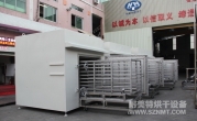 (8)烘干箱內(nèi)可存放1輛推車。推車配置耐高溫角輪(定向輪、萬向輪各2個),推車里面安裝限位柱用于定位里面托盤,兩側(cè)配有L形托架,用于支撐及左右限位托盤。進出口裝有手動爐門。頂部部置循環(huán)風機、蒸氣換熱器等裝置,排廢風機安裝在爐體頂部。